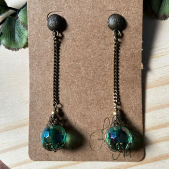 | Brinco com corrente de aprox. 4 cm, bola média facetada de vidro e base de pinos (taxinha) em ouro velho. Devido ao processo artesanal, as peças podem apresentar variações de cor e tamanho. |
